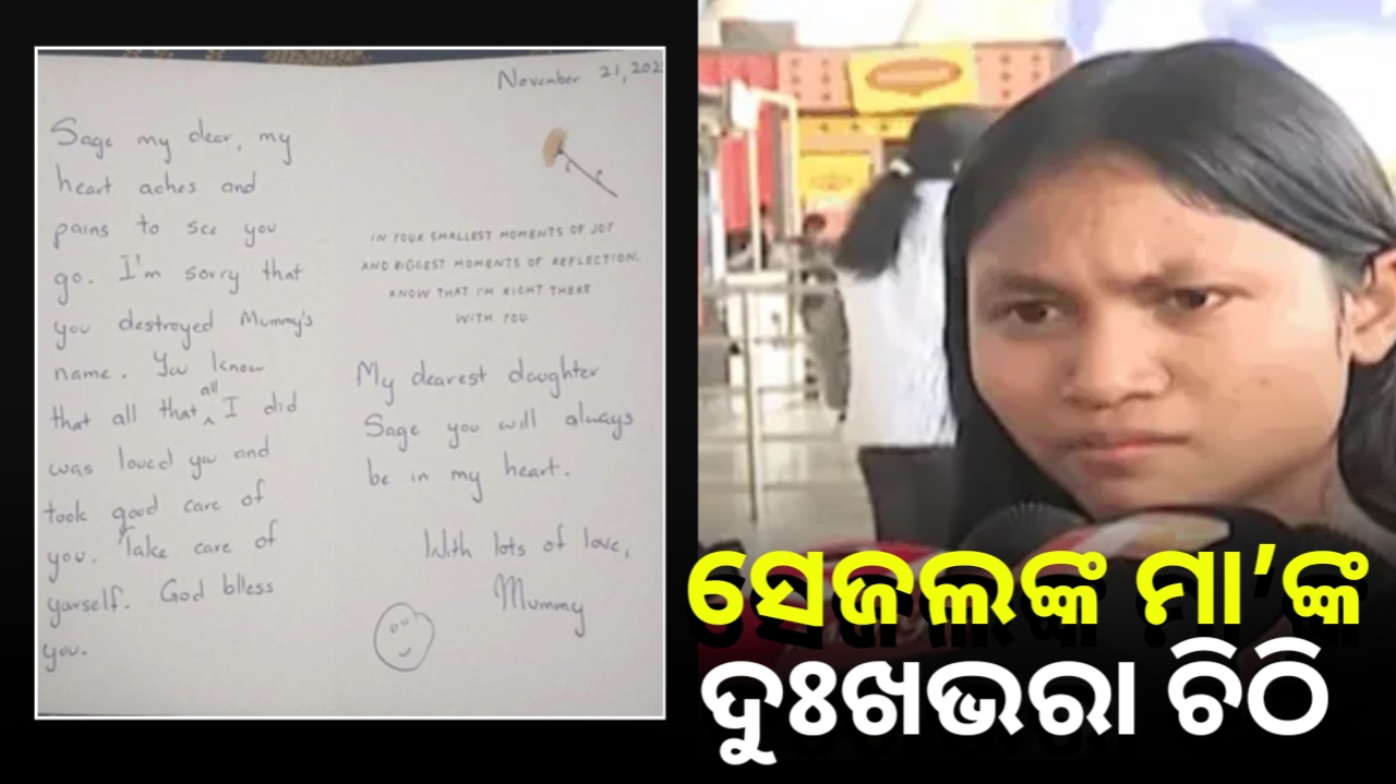 ମୋ ପ୍ରିୟତମା ସେଜ୍ ତୁମେ ସବୁଦିନ ମୋ ହୃଦୟରେ ଅଛ। ସ୍ନେହ ସହ ମୁଁ ତୁମକୁ ବିଦାୟ ଦେଉଛି। ସେଜଲଙ୍କ ଆମେରିକୀୟ ମାଆଙ୍କ ଏମିତି ଏକ ଦୁଃଖଭରା ଚିଠି…. ।ସୂଚନା ଥାଉକି, ନଭେମ୍ବର ୨୧ରେ ସେଜଲ ଆମେରିକା ଛାଡ଼ିବା ସମୟରେ ତାଙ୍କ ପାଳିତ ମା’ ଏହି ଚିଠି ଦେଇଥିଲେ। ଯାହା ଏବେ ଖୁବ୍ ଭାଇରାଲ ହେବାରେ ଲାଗିଛି।