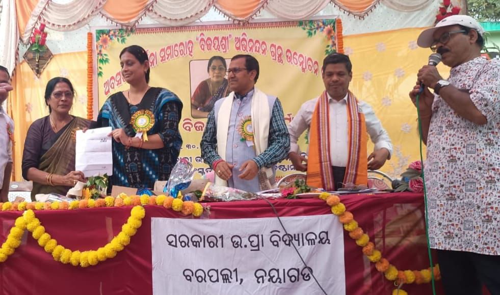 ନୟାଗଡ଼,(ଓଡ଼ିଶା ଦର୍ପଣ) :ନୟାଗଡ଼ ବ୍ଲକ ଅନ୍ତର୍ଗତ ସରକାରୀ ଉଚ୍ଚ ପ୍ରାଥମିକ ବିଦ୍ୟାଳୟ ବରପଲ୍ଲୀର ପ୍ରଧାନ ଶିକ୍ଷୟିତ୍ରୀ ବିଜୟଲକ୍ଷ୍ମୀ ଆଚାର୍ଯ୍ୟଙ୍କୁ ରବିବାର ଅବସର କାଳୀନ ସମ୍ବର୍ଦ୍ଧନା ପ୍ରଦାନ କରାଯାଇଛି l ବିଦ୍ୟାଳୟର ଭାରପ୍ରାପ୍ତ ପ୍ରଧାନ ଶିକ୍ଷକ ଅକ୍ଷୟ କୁମାର ପରିଡାଙ୍କ ସଭାପତିତ୍ବରେ ଅନୁଷ୍ଠିତ ସମ୍ବର୍ଦ୍ଧନା ଉତ୍ସବକୁ ନୟାଗଡ଼ ଜିଲ୍ଲା ଅତିରିକ୍ତ ଶିକ୍ଷା ଅଧିକାରୀ ଗୀତାଞ୍ଜଳି ସାହୁ ଉଦଘାଟନ କରିଥିବା ବେଳେ ଓଡ଼ିଆ ବିଶ୍ୱ ବିଦ୍ୟାଳୟ କୁଳପତି ପ୍ରଫେସର ଶତ୍ରୁଘ୍ନ ପାଣିଗ୍ରାହୀ ମୁଖ୍ୟ ଅତିଥି, ପ୍ରାଧ୍ୟାପକ ସୁଧାକର ପଣ୍ଡା ମୁଖ୍ୟ ବକ୍ତା, ବିଦ୍ୟାଳୟ ପରିଚାଳନା କମିଟି ସଭାପତି ଅଧ୍ୟପକ କୃପାସିନ୍ଧୁ ସ୍ୱାଇଁ, ବନବାସୀ ସଂସ୍କୃତ କଲେଜ ଦଶପଲ୍ଲା ଅଧ୍ୟାପକ ସରୋଜ ପ୍ରଧାନ,ଶିକ୍ଷକ ନେତା ଜ୍ୟୋତି ରଞ୍ଜନ ଦାଶ,ଗଣେଶ ଚନ୍ଦ୍ର ଦାଶ ପ୍ରମୁଖ ସମ୍ମାନୀତ ଅତିଥି ରୂପେ ଯୋଗଦେଇ ପ୍ରଧାନ ଶିକ୍ଷୟିତ୍ରୀ ଶ୍ରୀମତୀ ଆଚାର୍ଯ୍ୟଙ୍କର କର୍ତ୍ତବ୍ୟ ପରାୟଣତା, କର୍ମନିଷ୍ଠl ଓ ଶିକ୍ଷା ଦାନ ଶୈଳୀର ଉଚ୍ଚ ପ୍ରଂଶସା କରିଥିଲେ l ରାମଚନ୍ଦ୍ର ସଂସ୍କୃତ ସଂସ୍କୃତି ସଂଗଠନ ସଭାପତି ବିଜୟ କୁମାର ରଥ ସ୍ୱାଗତ ଭାଷଣ ଦେବା ପରେ ପରେ ଅଭିନନ୍ଦନ ଗ୍ରନ୍ଥ “ବିଜୟଶ୍ରୀ “କୁ ଅତିଥି ମାନେ ଉନ୍ମୋଚନ କରିଥିଲେ l ଏହି ଅବସରରେ ଅବସର ନେଇଥିବା ଶିକ୍ଷୟିତ୍ରୀଙ୍କୁ ବିଦ୍ୟାଳୟ ପକ୍ଷରୁ ମାନପତ୍ର, ଉପଢୌକନ, ପୁଷ୍ପ ଗୁଚ୍ଛ ପ୍ରଦାନ ପୂର୍ବକ ସମ୍ବର୍ଦ୍ଧନା ପ୍ରଦାନ କରାଯାଇଥିଲା l ସହକାରୀ ଶିକ୍ଷୟିତ୍ରୀ ସୁକୃତି ମହାପାତ୍ର ମଞ୍ଚ ପରିଚାଳନା କରିଥିବା ବେଳେ ସନ୍ଧ୍ୟାରାଣୀ ଶତପଥୀ, ପୁଷ୍ପଲତା ମହାପାତ୍ର, ପ୍ରଭାସିନୀ ମାଝୀ ପ୍ରମୁଖ ସହଯୋଗ କରିଥିଲେ l