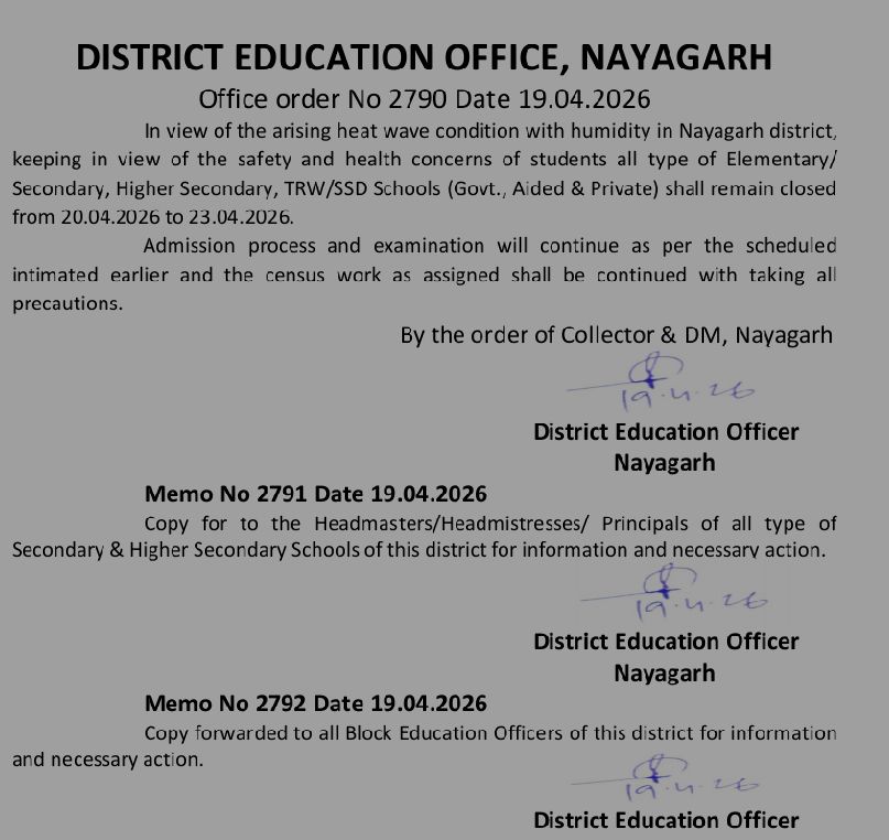 ନୟାଗଡ଼,(ଓଡ଼ିଶା ଦର୍ପଣ): ପ୍ରବଳ ଗ୍ରୀଷ୍ମ ପ୍ରବାହକୁ ଦୃଷ୍ଟିରେ ରଖି ନୟାଗଡ଼ ଜିଲ୍ଲା ପ୍ରଶାସନ ଜିଲ୍ଲାର ସମସ୍ତ ପ୍ରକାର ବିଦ୍ୟାଳୟ ଗୁଡ଼ିକୁ ଚଳିତ ମାସ ୨୦ରୁ ୨୩ ତାରିଖ ପର୍ଯ୍ୟନ୍ତ ଛୁଟି ଘୋଷଣା କରିଛନ୍ତି। ଜିଲ୍ଲାପାଳଙ୍କ ଆଦେଶ କ୍ରମେ ଜିଲ୍ଲା ଶିକ୍ଷାଧିକାରୀ ଚିଠି ନମ୍ବର ୨୭୯୦ ତା ୧୯.୪. ୨୬ ମାଧ୍ୟମରେ ଜିଲ୍ଲାର ସମସ୍ତ ପ୍ରକାରର ପ୍ରାଥମିକ, ଉଚ୍ଚ ପ୍ରାଥମିକ ଏବଂ ମାଧ୍ୟମିକ ବିଦ୍ୟାଳୟ ଗୁଡ଼ିକ ଛୁଟି ରହିବ। ତେବେ ଏହି ସମୟ ମଧ୍ୟରେ ବିଦ୍ୟାଳୟର ଅଫିସ ଖୋଲା ରହିବା ସହିତ ପିଲାଙ୍କ ନାମଲେଖା, ପରୀକ୍ଷାକାର୍ଯ୍ୟ ତଥା ଜନଗଣନା କାର୍ଯ୍ୟ ଯଥାରୀତି ଚାଲିବା ସହିତ ସମସ୍ତ ଶିକ୍ଷକ ଶିକ୍ଷୟିତ୍ରୀ ବିଦ୍ୟାଳୟ ଆସିବେ ବୋଲି ଜିଲ୍ଲା ଶିକ୍ଷା ବିଭାଗ ପକ୍ଷରୁ କୁହାଯାଇଛି।