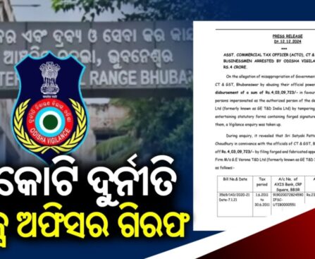ଭାଟ୍ ବାବଦ ୪କୋଟିରୁ ଊର୍ଦ୍ଧ୍ୱ ସରକାରୀ ଅର୍ଥ ହେରଫେର ନେଇ ଭୁବନେଶ୍ୱର ଭିଜିଲାନ୍ସରେ ଅଭିଯୋଗ ହୋଇଛି। ଏହି ଘଟଣାରେ ଭିଜିଲାନ୍ସ ଟିମ୍ କୋରାପୁଟ ଜୟପୁରର ସିଟି ଆଣ୍ଡ ଜିଏସ୍ଟି କାର୍ଯ୍ୟାଳୟର ଆସିଷ୍ଟାଣ୍ଟ ବାଣିଜ୍ୟ କର ଅଧିକାରୀ ଓ ୨ଜଣ ବ୍ୟବସାୟୀଙ୍କୁ ଗିରଫ କରିଛି। ଭିଜିଲାନ୍ସ ପକ୍ଷରୁ ମିଳିଥିବା ସୂଚନା ଅନୁସାରେ, ଭୁବନେଶ୍ୱରସ୍ଥିତ ସିଟିଆଣ୍ଡଜିଏସଟି ଅଫିସର ନିଜ କ୍ଷମତାର ଦୁରୂପଯୋଗ କରି ସରକାରୀ ଅର୍ଥ ତୋଷାରପାତ କରିଥିବାର ଅଭିଯୋଗ ହୋଇଥିଲା । ଯାହାର ତଦନ୍ତ କରି ଭିଜିଲାନ୍ସ ଜାଣିବାକୁ […]